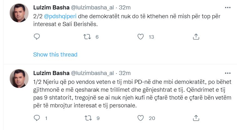 “Njeriu që po vendos veten e tij mbi PD-në dhe mbi demokratët, po bëhet gjithmonë e më qesharak me trillimet dhe gënjeshtrat e tij. Qëndrimet e tij pas 9 shtatorit, tregojnë se ai nuk njeh kufi në çfarë thotë e çfarë bën vetëm për të mbrojtur interesat e tij personale. PD dhe demokratët nuk do të kthehen në mish për top për interesat e Sali Berishës.” – shkruan Basha.