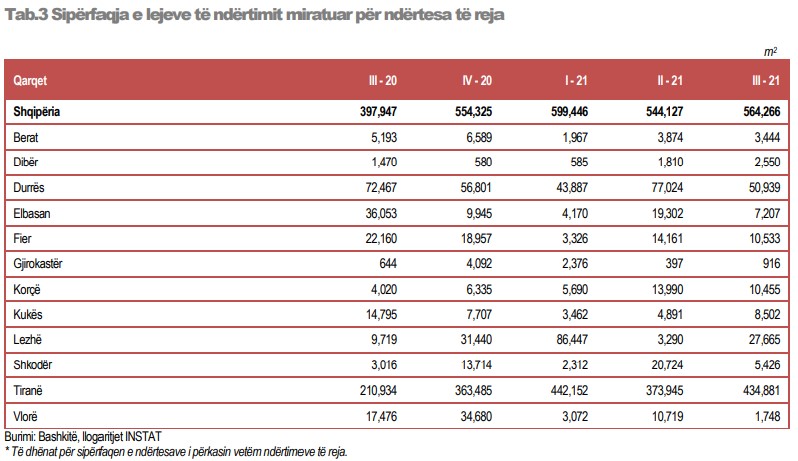 Sipërfaqja e lejeve të ndërtimit miratuar për ndërtesa të reja, në tremujorin e tretë 2021, është 564.266 m2, nga 397.947 m2 miratuar në tremujorin e tretë 2020, duke shënuar një rritje prej 41,8 %.