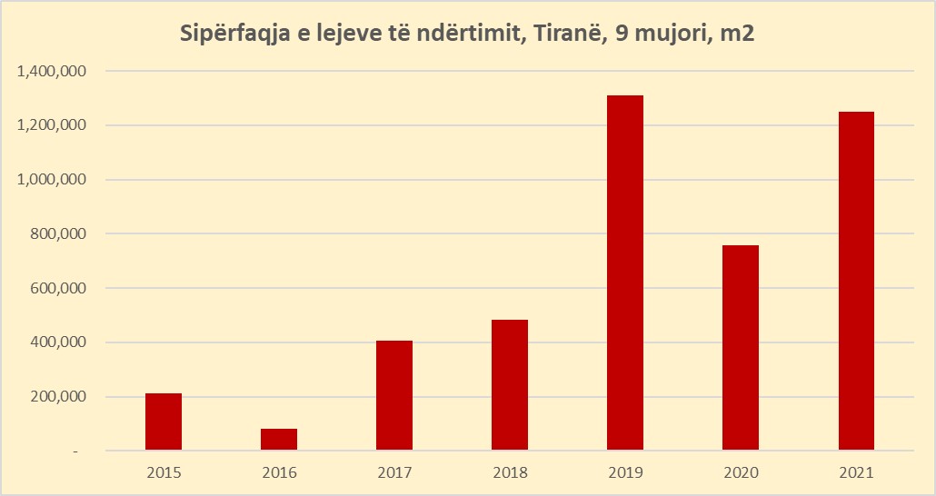 Sipërfaqja e lejeve të dhëna në janar-shtator 2021 po i i afrohet rekordit më të lartë të më shumë se një dekade, që u arrit në 2019-n, duke qenë vetëm 4.5% më e ulët. Nëse edhe tremujori i katërt vijon me të njëjtat ritme, 2021-shi mund të shënojë rekordin e viteve të fundit, teksa në muajt e fundit të 2016-s sipërfaqja e lejeve u reduktua ndjeshëm për shkak të stepjes nga tërmeti i 26 nëntorit.