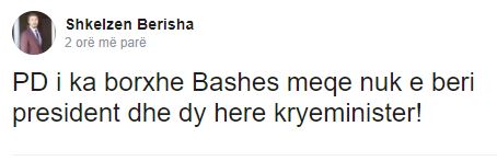 Me ironi, Shkëlzen Berisha i cili rrallë bën postime e deklarata mbi situatën politike, shkruan: “PD i ka borxhe Lulzim Bashës, pasi nuk e bëri president dhe dy herë kryeministër”.