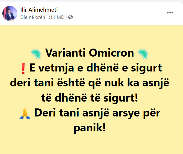 Duke marrë shkas nga paniku i krijuar për shkak të lajmeve të shumta mbi variantin e ri të quajtur “Omicron” të Covid-19, mjeku i njohur epidemiolog Ilir AliMehmeti ka qetësuar qytetarët shqiptarë përmes një mesazhi në rrjetet sociale.