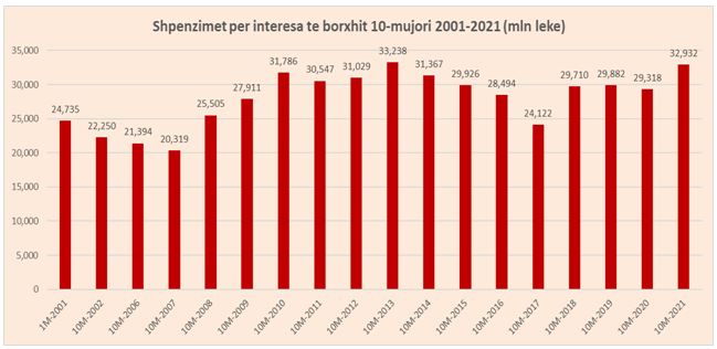 Rritja e shpenzimeve erdhi nga shtimi i stokut të borxhit publik, pasi normat e interesit vazhdojnë të jenë favorizuese. Shpenzimet për shlyerjen e interesave të borxhit u rriten me 12 për qind në 10 mujorin 2021 në raport me të njëjtën periudhe të vitit 2020.