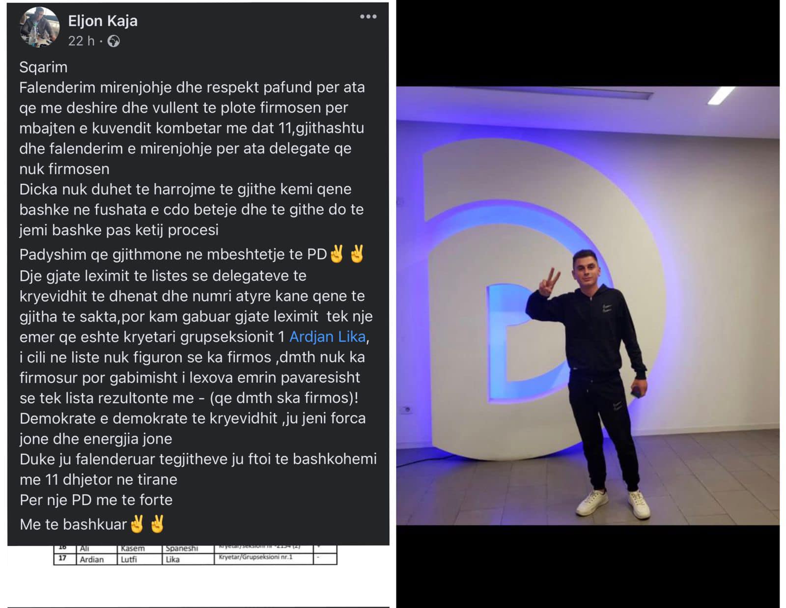 Ky është sqarimi i dytë nga unë për këtë çështje, i pari ishte disa orë pas leximit të firmave sepse gjatë leximit të tyre të Grupseksionit Kryevidh ndodhi një lapsus shpejtësie dhe u lexua një delegat që nuk kishte firmosur dhe për këtë gjë kam komunikuar delegatin i cili është dhe kryetari i grupseksionit Ardian Lika dhe i kërkova ndiejë personalisht dhe publikisht me anë të një statusi për të qenë korrekt në këtë proces dhe moralisht.