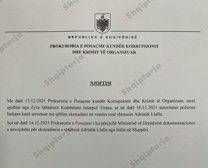 SPAK-u i ka dërguar Ministrisë së Drejtësisë dokumentacionin për ekstradimin e ish-Kryeprokurorit Adriatik Llalla, i cili u arrestua ditën e djeshme në kryeqytetin italian, Romë.