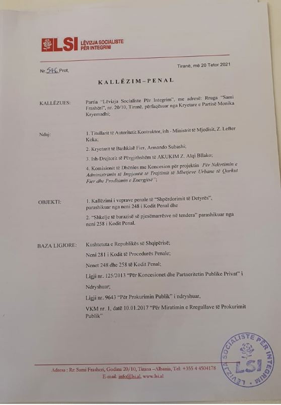 Në kallëzimin e LSI-së thuhet se ish-ministri i Mjedisit Lefter Koka, ish-sekretari i Përgjithshëm i kësaj ministrie sot deputet i Partisë Socialiste, Alqi Bllako dhe kryetari i Bashkisë së Fierit, Armando Subashi kanë kryer dy vepra penale atë të ‘Shkeljes së barazisë në tendera’ dhe ‘Shpërdorimin e Detyrës’.