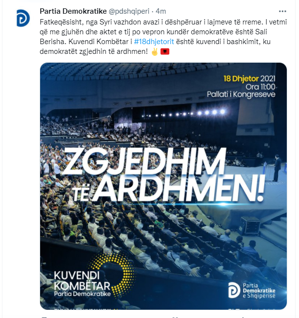 “Fatkeqësisht, nga Syri vazhdon avazi i dëshpëruar i lajmeve të rreme. I vetmi që me gjuhën dhe aktet e tij po vepron kundër demokratëve është Sali Berisha. Kuvendi Kombëtar i 18dhjetorit është kuvendi i bashkimit, ku demokratët zgjedhin të ardhmen!”-shkruan PD.