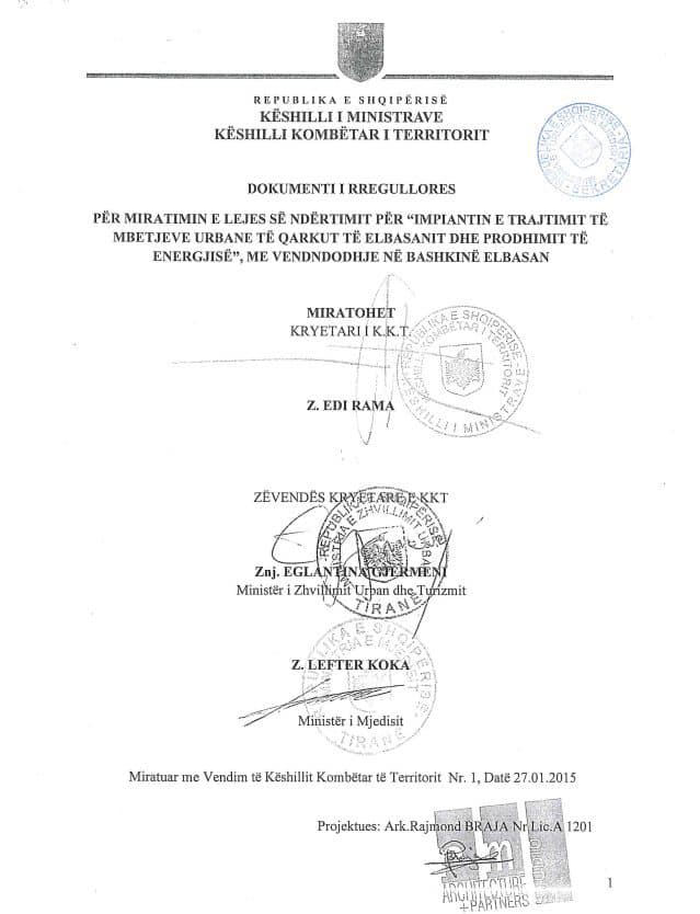 Kryemadhi ka publikuar një dokument me firmë të Edi Ramës në cilësinë e Kryetarit të Këshillit Kombëtar të Territorit për miratimin e lejes së ndërtimit të incineratorit të Elbasanit duke akuzuar kështu direkt Kryeministrin për përfshirjen në këtë aferë.