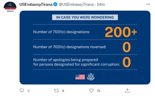 “Në rast se jeni kureshtarë: Numri i përcaktimeve të ligjit 7031 (c) është mbi 200. Numri i vendimeve të kthyera është 0. Numri i faljeve që po përgatiten për t’u bërë për personat e përcaktuar si të korruptuar është 0.”– shkruhet në postimin e ambasadës.