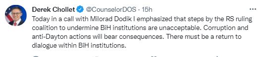 Korrupsioni dhe veprimet kundër Dejtonit do të kenë pasoja. Duhet të ketë një kthim në dialog brenda institucioneve të Bosnjës e Hercegovinës.”– ka shkruar Chollet.