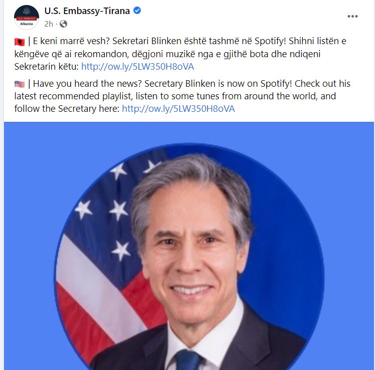 “E keni marrë vesh? Sekretari Blinken është tashmë në Spotify! Shihni listën e këngëve që ai rekomandon, dëgjoni muzikë nga e gjithë bota dhe ndiqeni Sekretarin këtu: http://ow.ly/5LW350H8oVA.” – shkruan ambasada në Facebook.