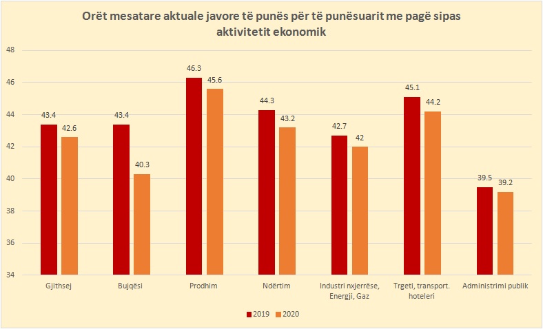 Sipas aktiviteteve ekonomike, sektorët ku të punësuarit qëndrojnë më gjatë në punë janë prodhimi, me 45.6 orë gjithsej, të ndjekura nga tregtia, akomodimi, hoteleria (44.2) ndërtimi (43.2), industria (42). Më e privilegjuar është administrata shtetërore, e cila punon mesatarisht 39.2 orë në javë, ose 3.4 orë në javë më pak sesa mesatarja kombëtare.