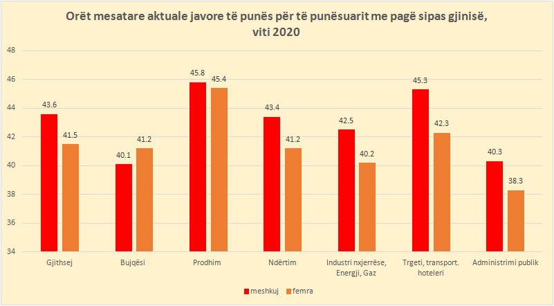 Femrat (41.5 orë) punojnë mesatarisht 2.1 orë në javë më pak sesa meshkujt (43.6 orë). Diferenca më e lartë mes femrave dhe meshkujve është në aktivitetet e tregtisë, hotelerisë, akomodimit (-3 orë).