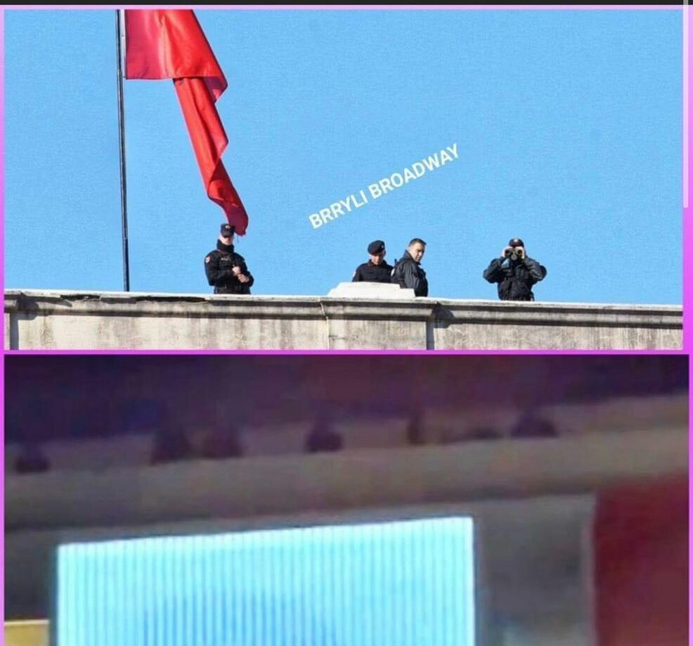 Në fotomontazh janë bashkuar dy fotografi. Në foton sipër tregohen punonjës të Grdës së Republikës që qëndrojnë sipër kryeministrisë gjatë ditës duke mbikëqyrur sipas të gjitha gjasave ndonjë nga protestat e opozitës.