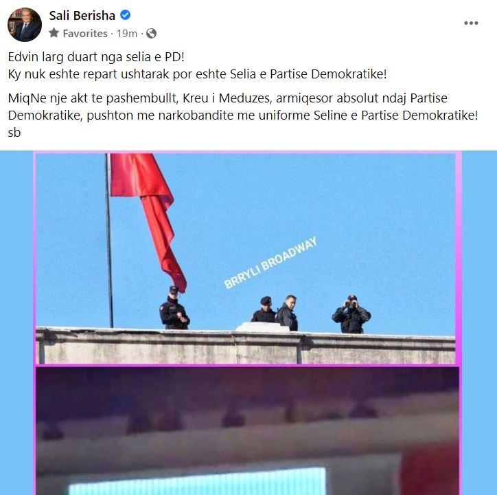 MiqNe nje akt te pashembullt, Kreu i Meduzes, armiqesor absolut ndaj Partise Demokratike, pushton me narkobandite me uniforme Seline e Partise Demokratike! Sb” – shkruan Berisha në postimin e tij.