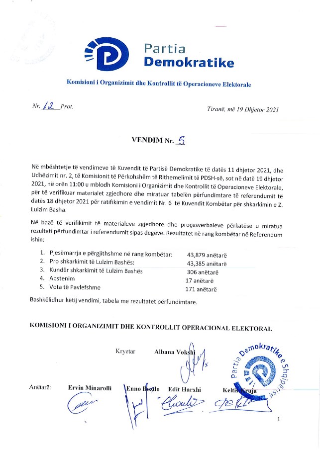 Komisioni i ngritur nga Grupi për Rithemelimin e PD-së për referendumin e ditës së djeshme ka publikuar rezultatet zyrtare.