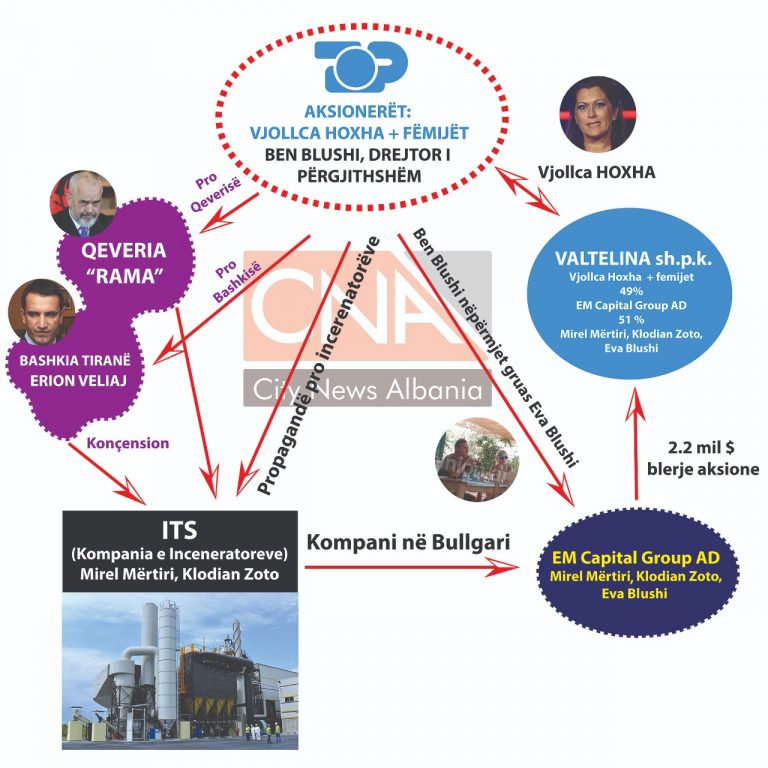 Nga ana tjetër është po Top Channel që ngrinte zjarr e flakë për mbetjet në Durrës, për Porto Romanon, kronika, lajme, emisione speciale për inceneratorët si një sukses i madh. Janë me miliona e miliona të paguara në llogaritë e këtij televizoni nga kompanitë e inceneratorëve dhe njerëzit e tyre, pa folur për ortakërinë e Vjollca Hoxhës me Mirel Mërtirin, Klodian Zoton dhe Eva Blushin.