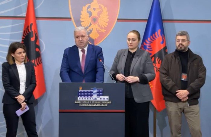 Drejtori i Departamentit të Policisë Kriminale në Policinë e Shtetit Tonin Vocaj, së bashku me prokuroren e Rrethit Gjyqësor Tiranë Elisabeta Imeraj, konferencë për shtyp për operacionin policor të koduar “Komunikimi”.