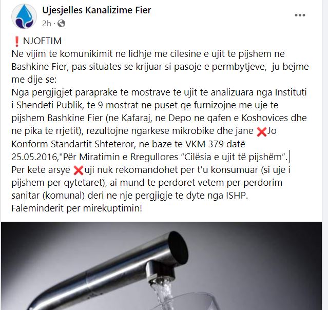 “Në vijim të komunikimit në lidhje me cilësinë e ujit të pijshëm në bashkinë e Fierit, pas situatës së krijuar si pasojë e përmbytjeve, ju bëjmë me dije se nga përgjigjet paraprake të mostrave të ujit të analizuara nga Instituti i Shëndetit Publik – të 9 mostrat në puset që furnizojnë me ujë të pijshëm bashkinë e Fierit, në Kafaraj, në Depo, në qafën e Koshovicës dhe në pika të rrjetit, – rezultojnë me ngarkesë mikrobike dhe janë jo konform standartit shtetëror, në bazë të VKM 379 datë 25.05.2016 “Për Miratimin e Rregullores “Cilësia e ujit të pijshëm”. Për këtë arsye uji nuk rekomandohet për t’u konsumuar si ujë i pijshëm për qytetarët. Ai mund të përdoret vetëm për përdorim sanitar (komunal) deri në një përgjigje të dytë nga ISHP.”