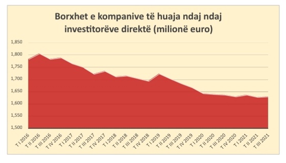 Krahasuar me të njëjtën periudhë të një viti më parë, detyrimet e borxhit të ndërmarrjeve të investimit direkt ndaj investitorëve direktë kanë pësuar një rënie të lehtë me 0.4%. Shifrat tregojnë se kompanitë e huaja mbështeten shpesh nga aksionerët jo vetëm me injektim kapitali, por edhe me huadhënie.