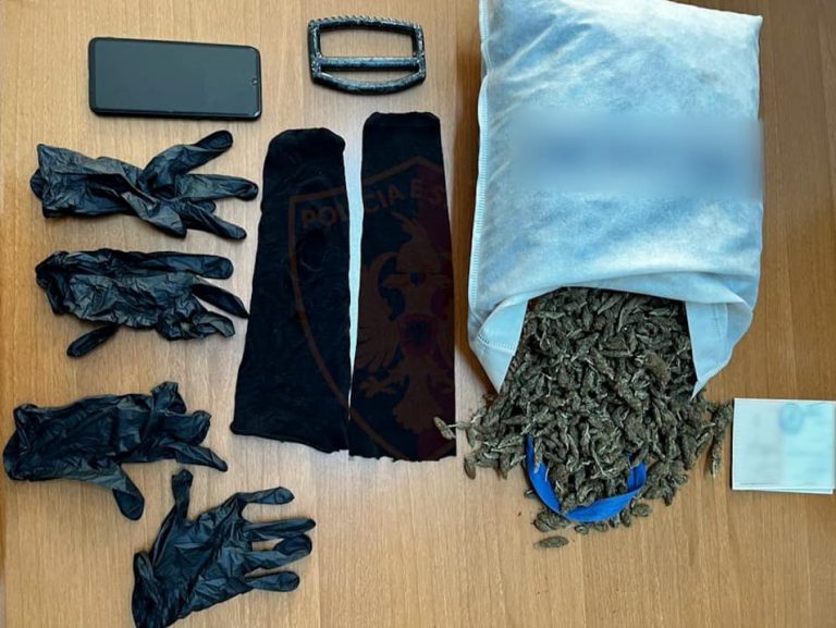 Sekuestrohen 2 kg e 200 gramë lëndë e dyshuar narkotike cannabis sativa, një automjet, një dorezë metalike (përforcues grushti), një aparat celular, doreza plastike dhe maska.