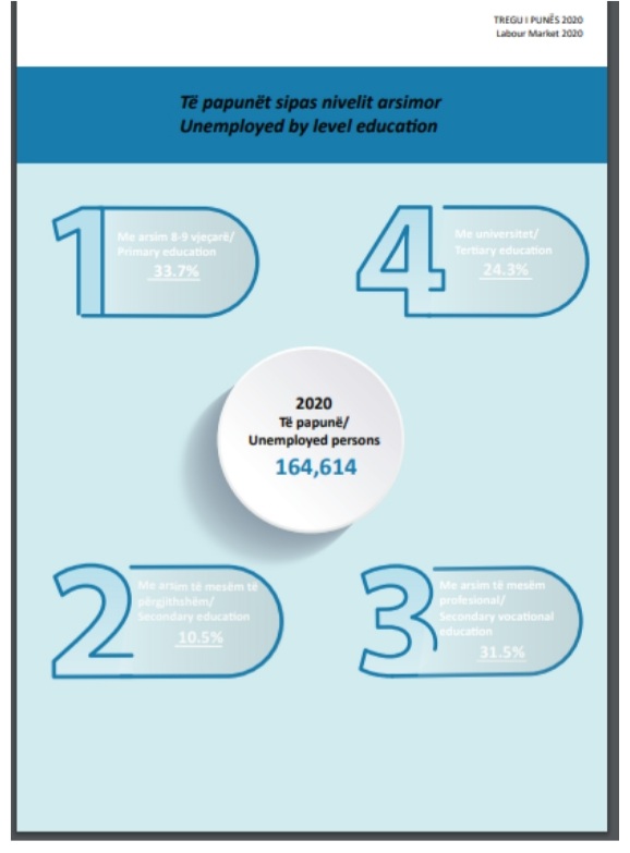 Duke analizuar zhvillimet në tregun e punës gjatë vitit 2020 INSTAT vërejti se 35 për qind të papunëve gjatë vitit të kaluar ishin me arsim profesional, ndërkohë që vetëm 10 për qind e të papunëve ishin me gjimnaz.