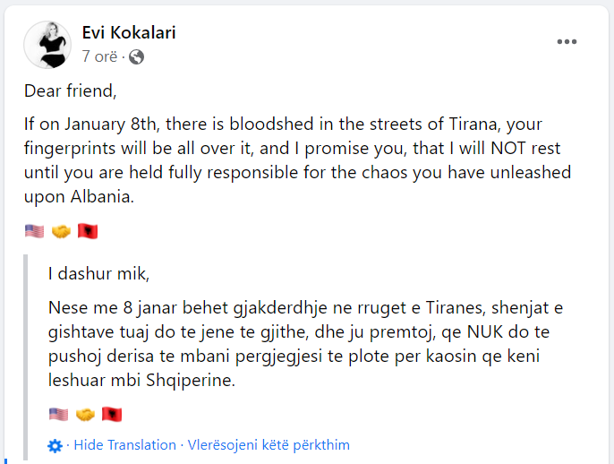 Nëse më 8 janar do ketë gjakderdhje në rrugët e Tiranës, shenjat e gishtave tuaj do të jenë kudo, dhe ju premtoj, që NUK do të pushoj derisa të mbani përgjegjësi të plotë për kaosin që keni krijuar në Shqipëri”-shkruan Kokalari.