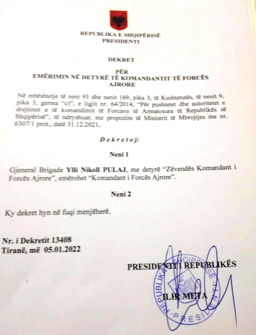 Presidenti Meta ka dekretuar emërimin e Gjeneralit Ylli Pulaj si Komandant të Forcave Ajrore të vendit.