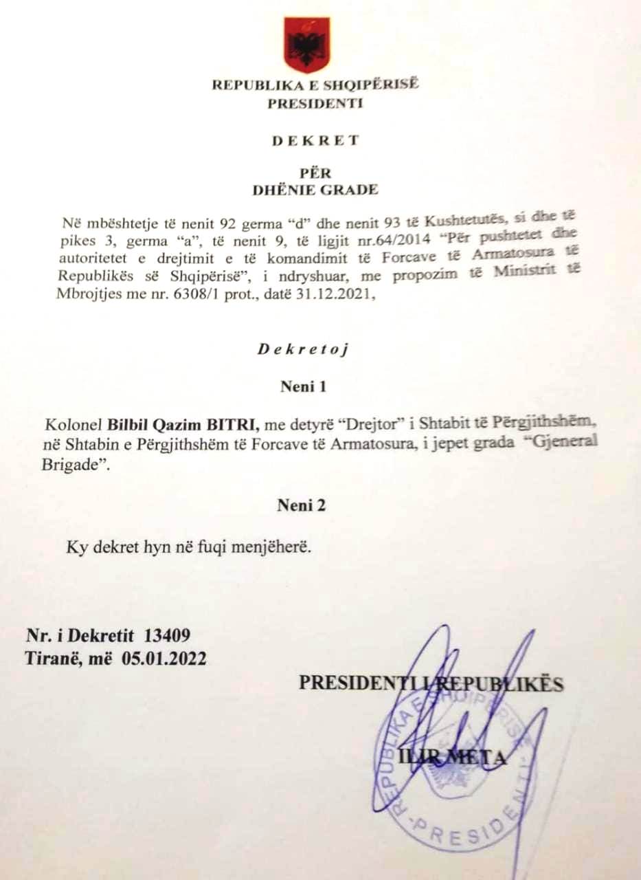 Po kështu kreu i shtetit ka dekretuar edhe dhënien e gradës Gjeneral Brigade të Bilbil Bitrit, i cili ka mbajtur deri më sot gradën e Kolonelit.