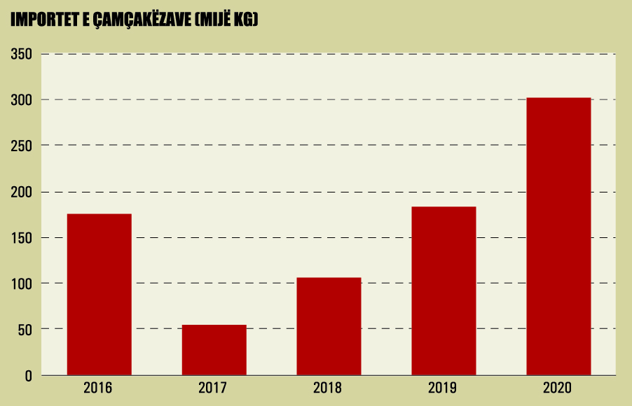Në 2020 janë importuar 182,876 kg çamçakëz. Konsumi për frymë i shqiptarëve ka qenë 64.2 gramë/shqiptar. (Një pako çamçakëz peshon 100 gr).