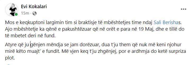 “Mos e keqkuptoni largimin tim si braktisje të mbështetjes time ndaj Sali Berishas. Ajo mbështetje ka qënë e pakushtëzuar që në orët e para në 19 Maj, dhe e tillë do të mbetet deri në fund. Atyre që ju gënjen mëndja se jam dorëzuar, dua t’ju them që nuk më keni njohur mirë këto muajt’ e fundit. Më vjen keq t’ju zhgënjej, por e ardhmja do ketë surpriza plot.” – shkruan Kokalari në Facebook.