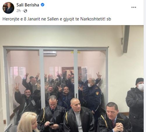 “Heronjtë e 8 Janarit në Sallën e gjyqit të Narkoshtetit!”- shkruan Berisha krahas një fotoje. Në një tjetër postim, i quan të arrestuarit si “të pamposhturit”.