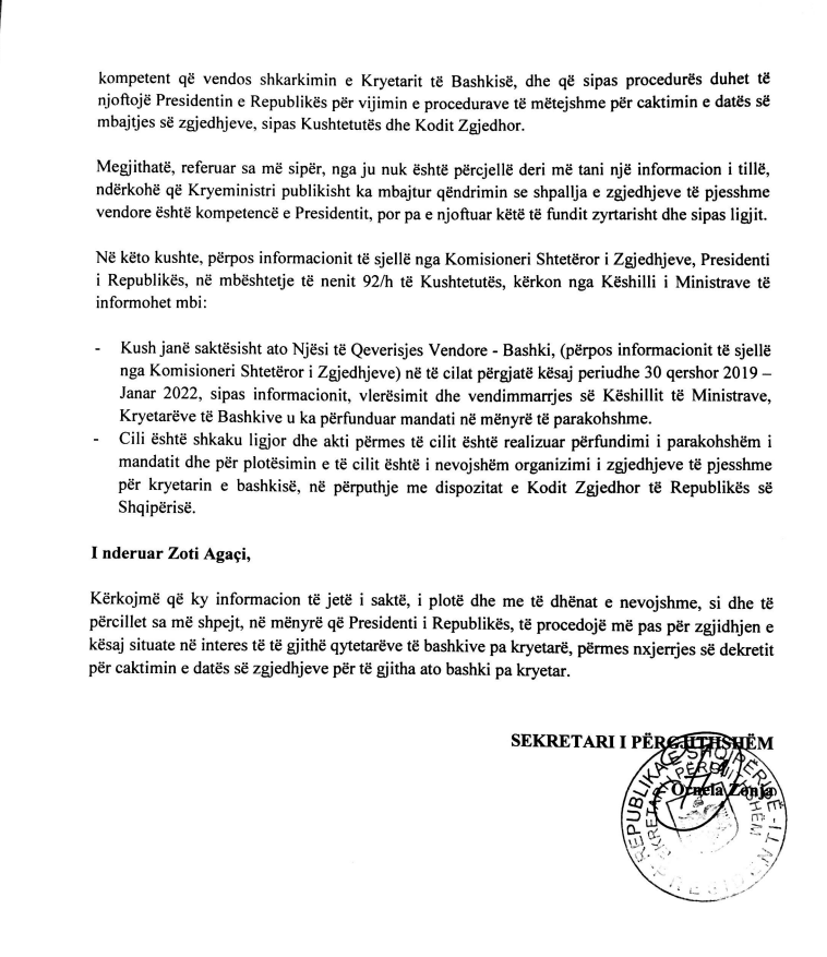 Letra vjen pas kthim përgjigjes të Komisionit Qendror të Zgjedhjeve i cili vuri në dijeni Presidentin se në dijeninë e këtij institucioni janë 3 bashki pa kryetar ndërsa për 3 të tjera nuk ishte informuar nga Këshilli i Ministrave.