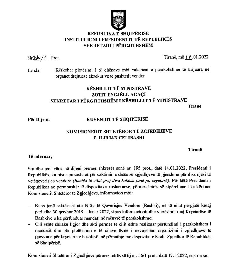 Kështu Presidenti i është drejtuar Kryeministrit për të ditur se cilat janë bashkitë pa kryetar dhe arsyen se pse i është ndërprerë mandati para kohe.