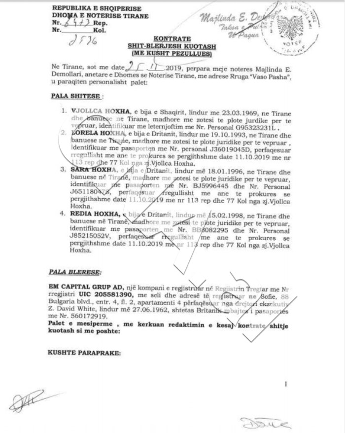 Bëhet fjalë për një kompani e themeluar në Bullgari, Em Capital Group, ku aksionerë janë Klodian Zoto me 34% të aksioneve, Mirel Mërtiti me 33% dhe Eva Blushi me 33%, dy të parët shpallur në kërkim nga SPAK.