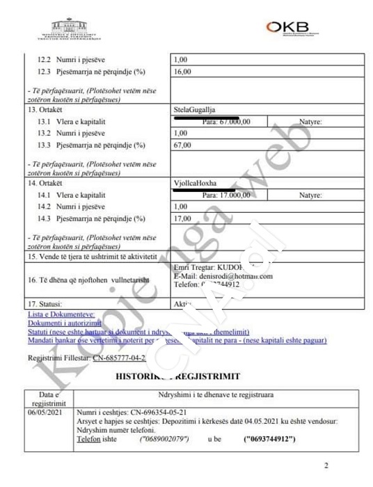 Në këtë kompani janë aksionerë Ben Blushi, Vjollca Hoxha dhe Stela Gugallja, pronarja e inceneratorit të Elbasanit, kjo e shpallur në kërkim nga SPAK.