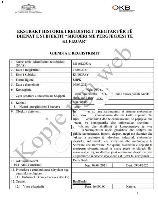 Nga ana tjetër është edhe një kompani e dytë, Kudo Pay, ku Ben Blushi dhe aksionerja e Top Channel, Vjollca Hoxha dalin hapur me emrat e tyre.