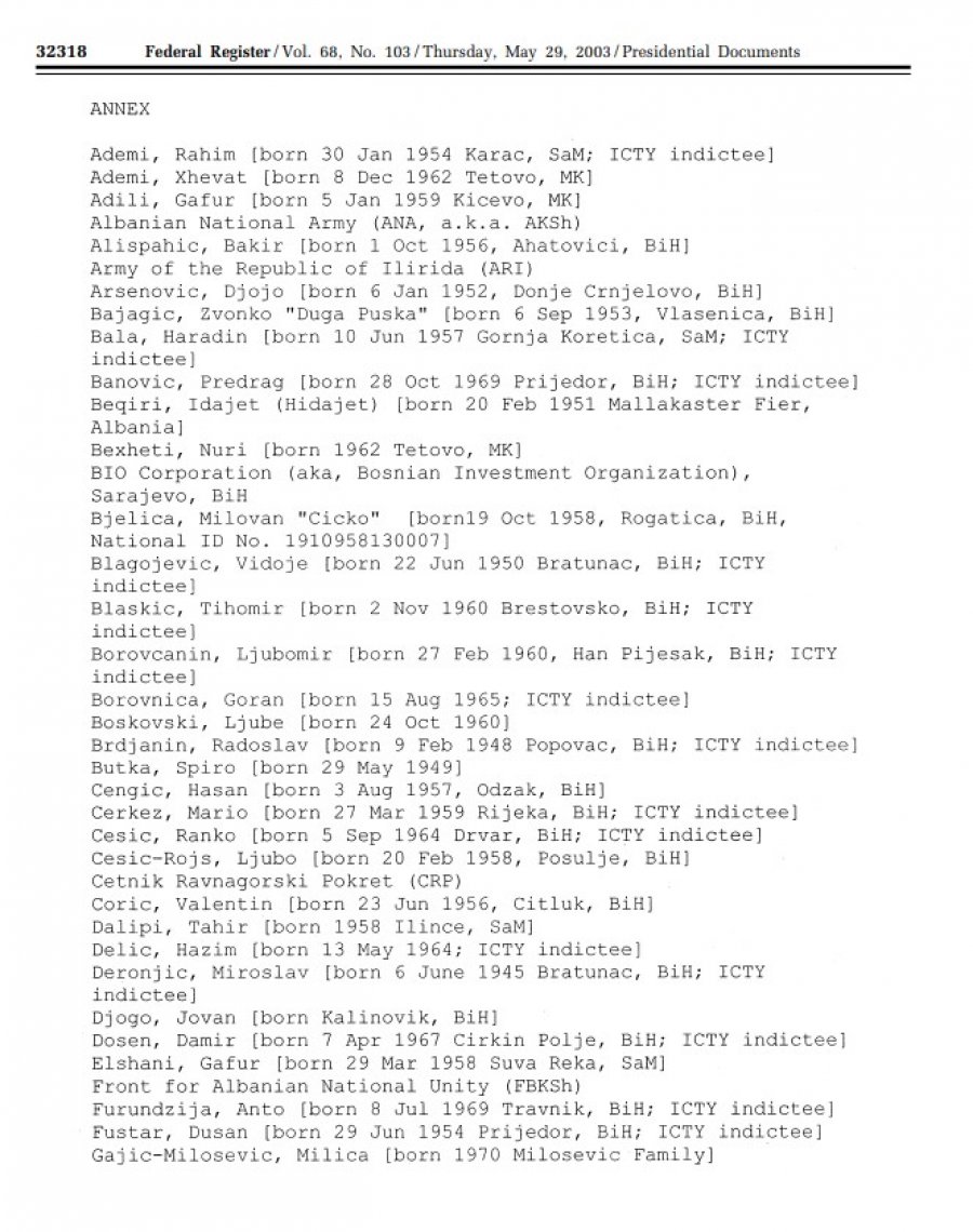 Lista e përditësuar e sanksioneve në vitin 2003, mungon emri i Ali Ahmetit