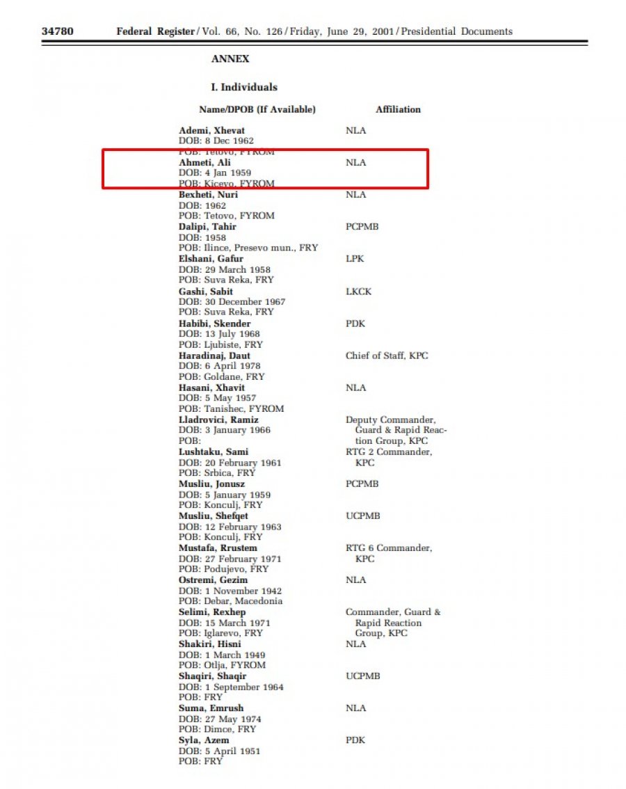 Sakaq, Syri.net ka siguruar ekskluzivisht një urdhër ekzekutiv të presidentit të SHBA George W.Bush të vitit 2001, ku shpallej non grata udhëheqësi i shqiptarëve të Maqedonisë së Veriut, Ali Ahmeti, ish-komandant i UÇK, aktualisht kryetar i partisë Bashkimi Demokratik për Integrim (BDI).