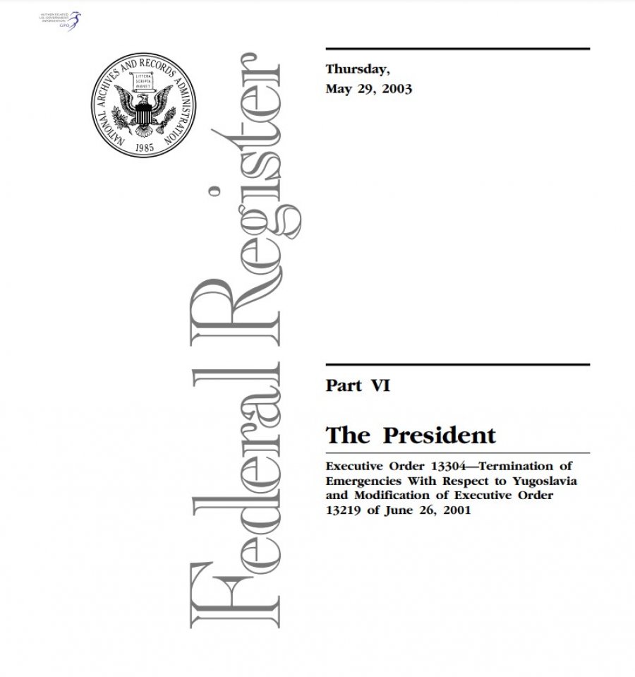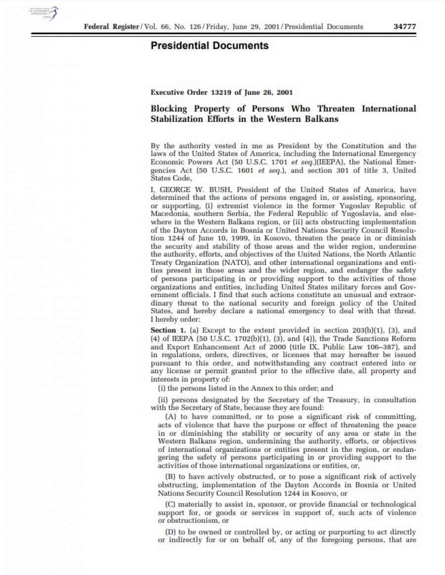 Vendimi ‘Urdhër Ekzekutiv 13219’, mban datën 29 qershor 2001 për ‘Bllokimin e pronave të personave që kërcënojnë përpjekjet ndërkombëtare për stabilizimin në Ballkanin Perëndimor’.