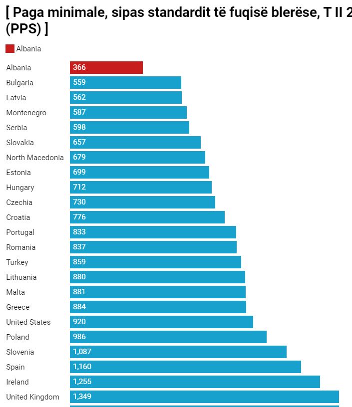 Sipas Eurostat, paga minimale në Shqipëri, e matur sipas standardit të fuqisë blerëse është 365 PPS, ndërsa në Mal të Zi dhe Serbi, ky indikator është rreth 590-600 PPS, pothuajse dy herë më e lartë sesa në Shqipëri.