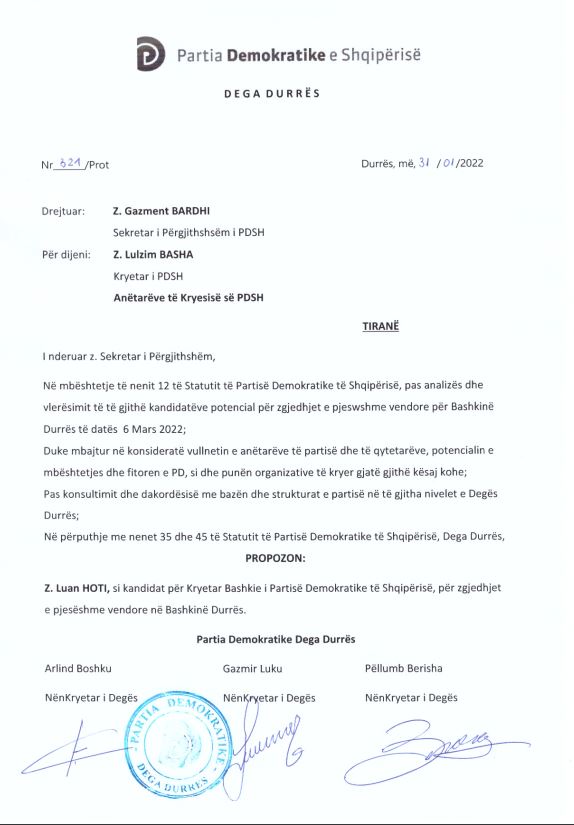 Dega e Partisë Demokratike në Durrës i ka propozuar kryesisë dhe Kryetarit, Lulzim Basha një emër për kandidat për Kryetar Bashkie.