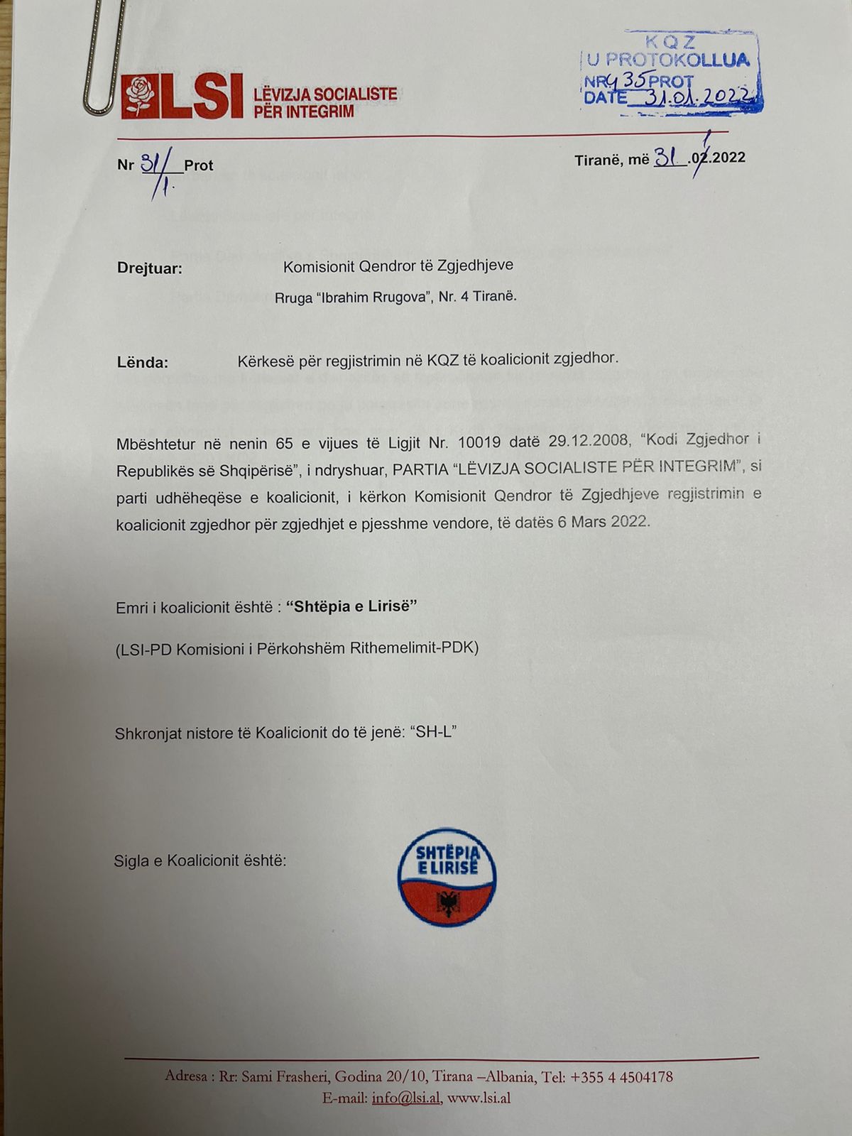 Koalicioni “Shtëpia e Lirisë” ka dorëzuar sot në KQZ kërkesën për regjistrimin në zgjedhjet e pjesshme lokale të 6 marsit.