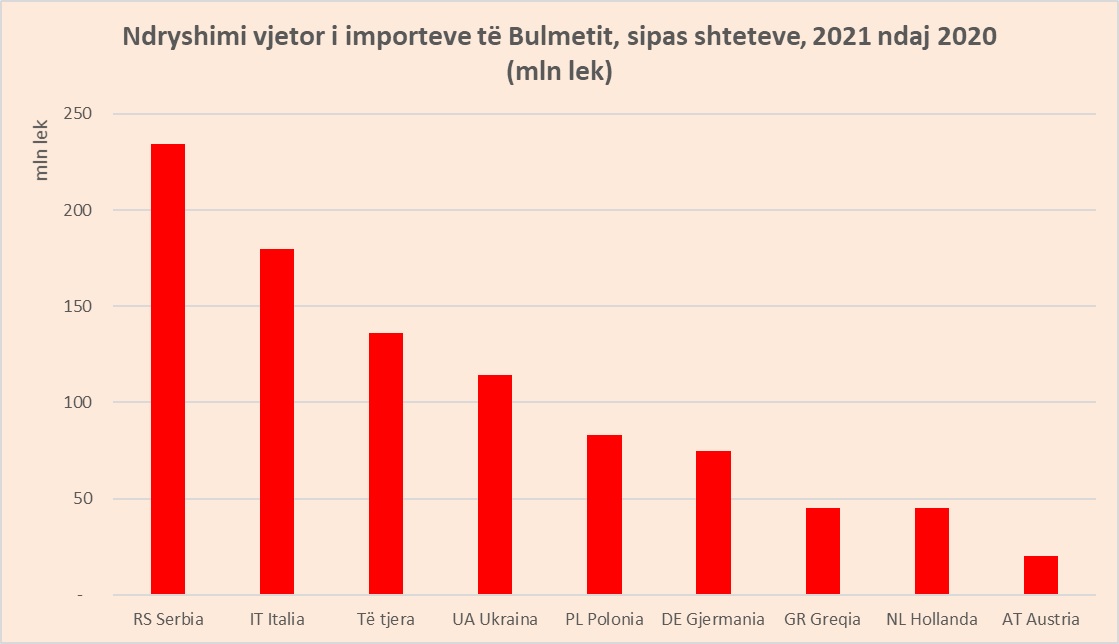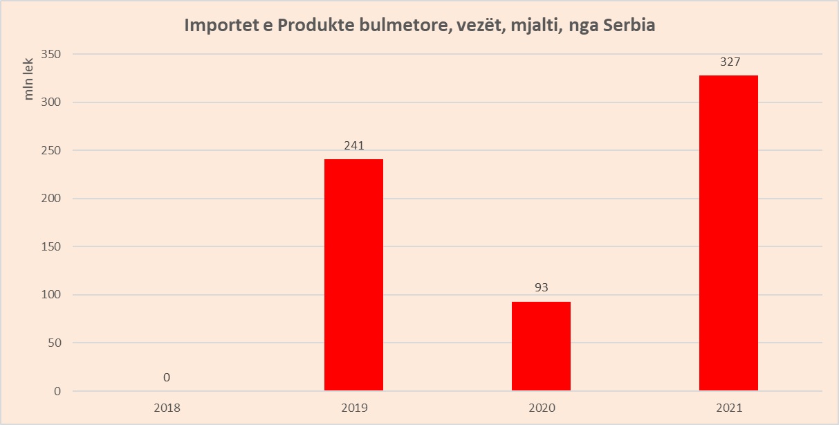 Të dhëna më të detajuara tregojnë se, importet në këtë grup udhëhiqen nga bulmeti dhe se rritja gjatë vitit 2021 është krijuar nga shtimi i importeve të qumështit nga Serbia, e cila ka ndikuar në 25% të totalit të rritjes totale.
