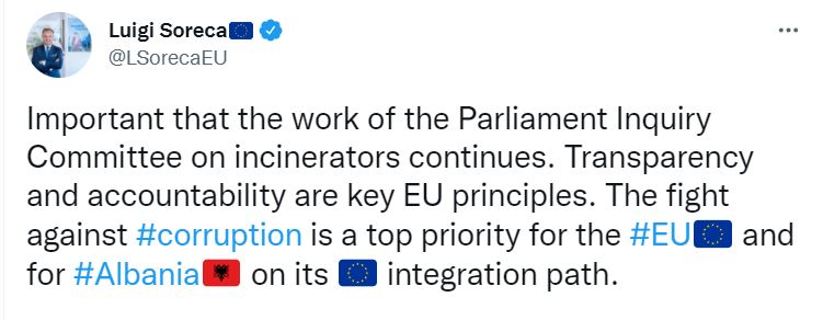 “E rëndësishme që puna e Komisionit Hetimor të Parlamentit për incineratorët të vazhdojë. Transparenca dhe llogaridhënia janë parimet kryesore të BE-së. Lufta kundër korrupsionit është një prioritet kryesor për BE-në dhe për Shqipërinë në rrugën e saj të integrimit në BE.” – shkruan Soreca në Twitter.