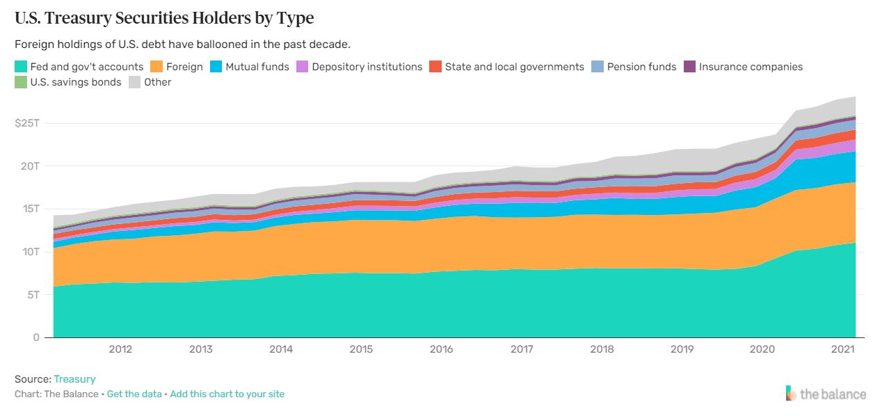 Një tjetër pjesë e borxhit, rreth 6.5 trilionë dollarë i detyrohet nga qeveria federale e SHBA-së, kryesisht fondeve të sigurimeve shoqërore dhe fondit të pensionit ushtarak. Gjatë rrjedhës së pandemisë, Rezerva Federale gjithashtu dyfishoi bilancin e saj në 8.9 trilionë dollarë duke blerë në mënyrë agresive triliona dollarë në bono thesari dhe letra me vlerë.