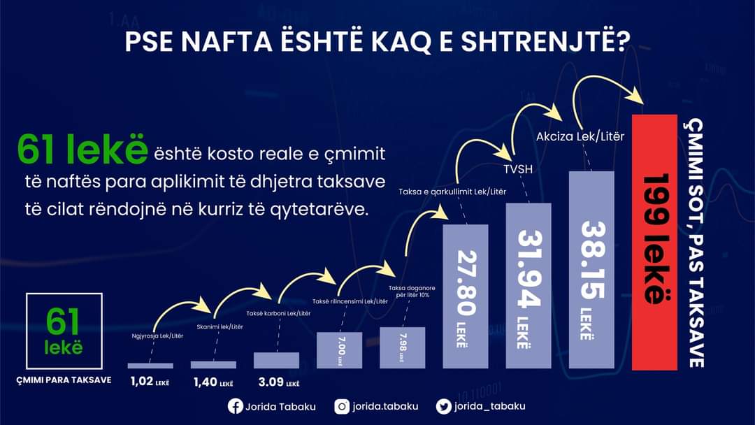 Ajo ka publikuar një grafik në llogarinë e saj zyrtare në “Facebook”, Tabaku thekson se 61 lekë është kostoja reale me të cilën vjen nga tregjet ndërkombëtare një litër naftë. Por ndërkohë, sipas Tabakut taksat e shndërrojnë atë në 199 lekë/litër.