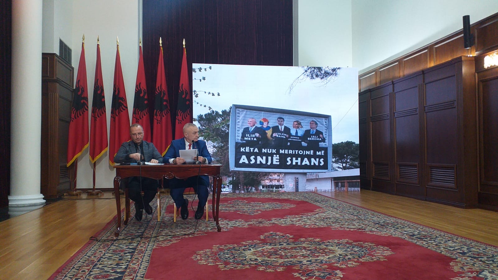 Presidenti Ilir Meta gjatë konferencës për shtyp nxori një poster ku akuzoi se qeverinë që po sulmonte atë gjatë fushatës zgjedhore të vitit të kaluar.