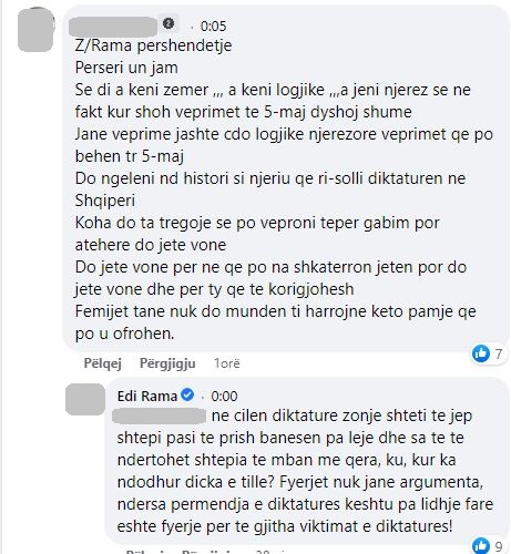Ai e pyet qytetaren se në cilën diktature shteti u jep banesa atyre që i kanë ndërtuar ato pa leje, pasi ua shemb. Rama shkruan se fyerjet nuk janë argumenta dhe se përmendja e diktaturës këtu është fyerje për të gjitha viktimat e saj.