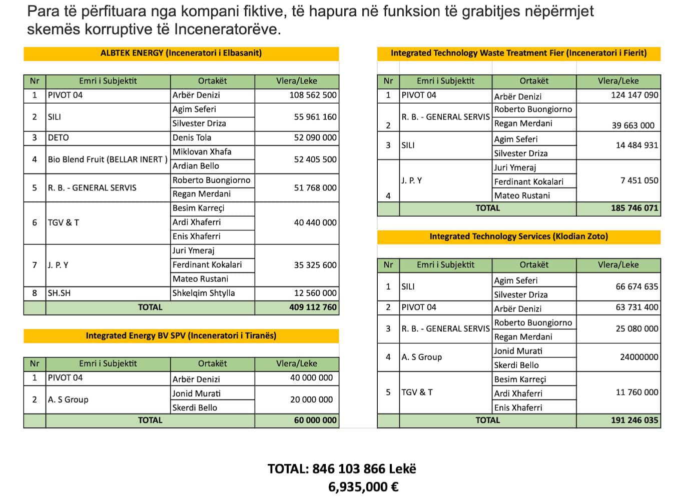 Shikoni dhe njëherë se si, të njejtat kompani fiktive që zyrtarët i kanë përdorur në rastin e Elbasanit për të marrë përfitime të parregullta monetare, janë përdorur edhe në inceneratorin e Tiranës dhe Fierit. Koha për veprim!”-shkruan kryetarja e LSI.