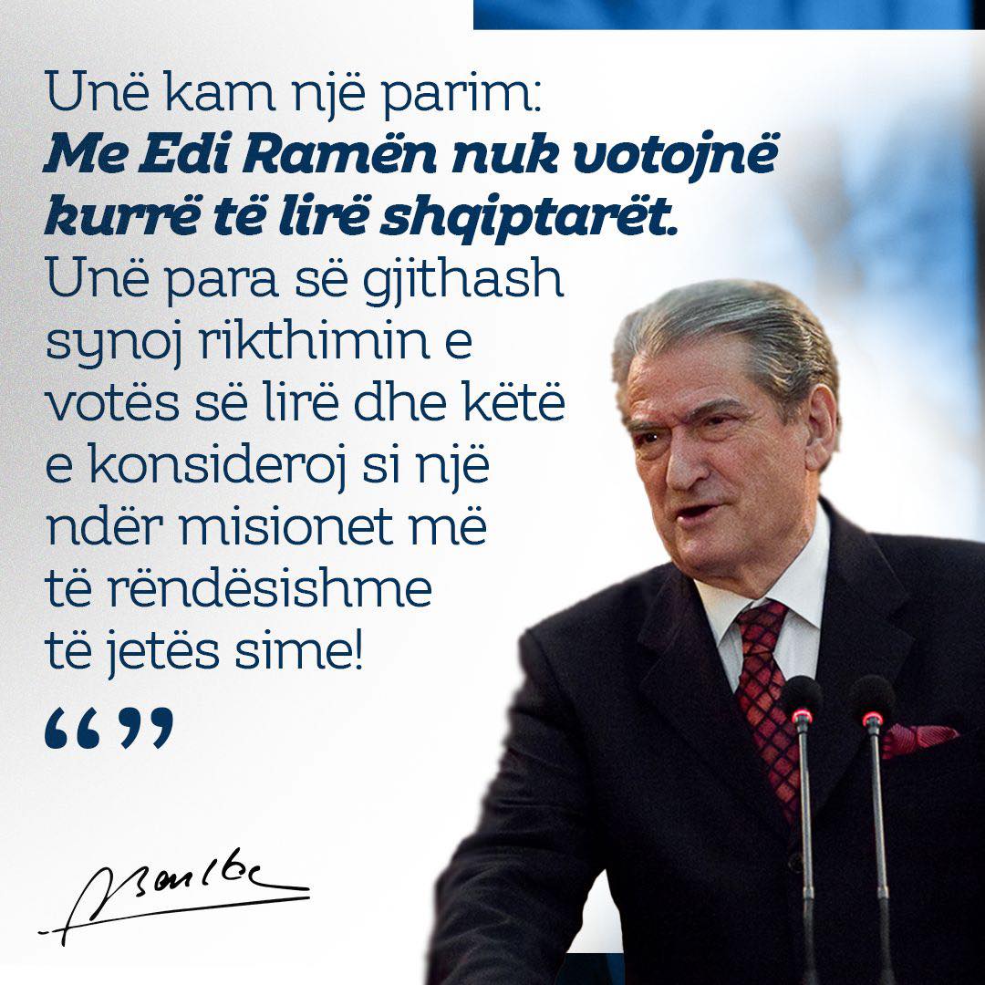 “Unë kam një parim: Me Edi Ramën nuk votojnë kurrë të lirë shqiptarët. Unë para se gjithash synon rikthimin e votës së lirë dhe këtë e konsideroj si një ndër misionet më të rëndësishme të jetës sime.” – shkruan Berisha.